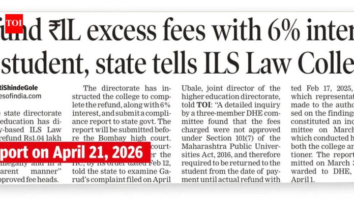 पुणे: आयएलएस लॉ कॉलेजच्या माजी विद्यार्थ्यांनी संस्थेच्या अध्यक्षांना पत्र लिहून बेकायदेशीर शुल्क वसुली, विद्यार्थ्यांचे आंदोलन दडपून टाकणे, पारदर्शकतेचा अभाव आणि प्रशासनातील गंभीर त्रुटी या आरोपांच्या पार्श्वभूमीवर संस्थेच्या कामकाजात तातडीने सुधारणा करण्याची मागणी केली आहे.23 एप्रिल 2026 रोजीचे पत्र, महाविद्यालयात सुरू असलेल्या फीच्या रांगेत आले आहे, जिथे विद्यार्थ्यांनी प्रशासनावर अनधिकृत किंवा जास्त शुल्क आकारल्याचा आरोप केला आहे आणि परताव्याची मागणी केली आहे. राज्य सरकारने संबंधित प्रकरणात कारवाईचे आदेश दिले आहेत.ILS च्या गव्हर्निंग कौन्सिलचे अध्यक्ष एसव्ही कानेटकर यांनी मंगळवारी TOI ला सांगितले की ते प्रवास करत होते आणि 30 एप्रिलपर्यंत पुण्यात परतल्यानंतर या प्रकरणाची चौकशी करू. “विद्यार्थ्यांनी केलेले सर्व दावे खोटे आहेत. आम्ही आमची बाजू नंतरच्या काळात स्पष्ट करू,” तो म्हणाला.विद्यार्थ्यांचे समर्थन करताना, ILS माजी विद्यार्थ्यांनी दावा केला की योग्य प्रकटीकरण न करता, “पारदर्शक आणि बेकायदेशीर” पद्धतीने अनेक शीर्षकाखाली फी गोळा केली गेली. “हा निधी कसा वापरला गेला याची माहिती विद्यार्थी आणि पालकांना कधीच दिली गेली नाही,” असे पत्रात म्हटले आहे, कॉलेज व्यवस्थापनाकडून जबाबदारी घेण्याची मागणी केली आहे.माजी विद्यार्थ्यांच्या पत्रात विद्यार्थ्यांचे आंदोलन ज्या पद्धतीने हाताळले गेले त्यावरही टीका करण्यात आली आहे. गेल्या वर्षी झालेल्या निषेधाचा संदर्भ देत, त्यांनी आरोप केला की प्रशासनाने विद्यार्थ्यांना शिस्तभंगाच्या कारवाईचा इशारा दिला आणि निषेध रोखण्यासाठी कॅम्पसमध्ये पोलिस कर्मचारी तैनात केले. “विद्यार्थी महाविद्यालयाच्या निर्णयांवर प्रश्नचिन्ह उपस्थित करू शकत नाहीत का? जर टीका दडपली गेली तर उत्तरदायित्व अस्तित्वात नाही,” असे पत्रात म्हटले आहे.व्यापक प्रशासनाची चिंता वाढवत, माजी विद्यार्थ्यांनी आर्थिक अनियमितता आणि कॅम्पस सुविधांशी संबंधित तक्रारींचे निराकरण करण्यात पारदर्शकतेचा अभाव असल्याचा आरोप केला. त्यांनी असा दावा केला की जेव्हा काही प्रकरणांमध्ये अंतर्गत कारवाई करण्यात आली तेव्हा कोणताही तपशीलवार अहवाल विद्यार्थ्यांसोबत शेअर केला गेला नाही.
